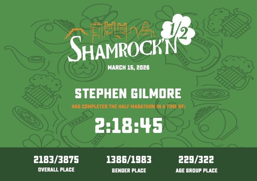 My goal was just to finish. Based on my training runs, it looked like I might run a 2:45:00 time, but I beat it by about 30 minutes. I was trying to run by heart rate, but it felt boringly slow. A few miles in, I switched to a 90s/30s run walk and it carried me through the end of the race.